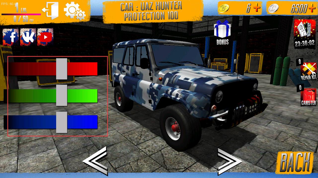 1、可调整车辆颜色,通过红、绿、蓝三色滑块自定义爱车外观,打造专属越野座驾。