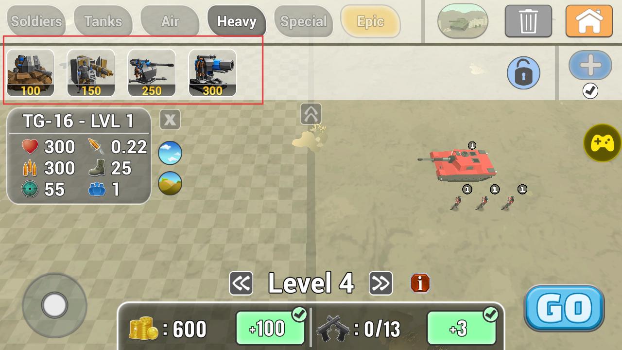 2、进入Level4战场设置界面,拖动重型装备、飞机、装甲车到指定部署区域,调整各兵种的进攻路线,优化战术布局。