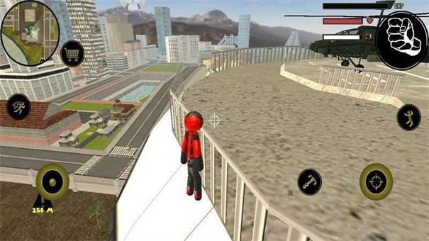 3、使用绳索技能,让火柴人向房屋发射绳索并摆动,体验独特的绳索移动方式,在城市中自由穿梭。