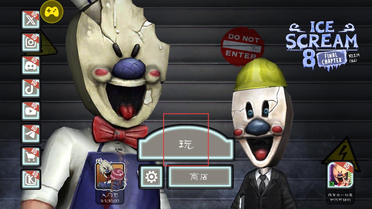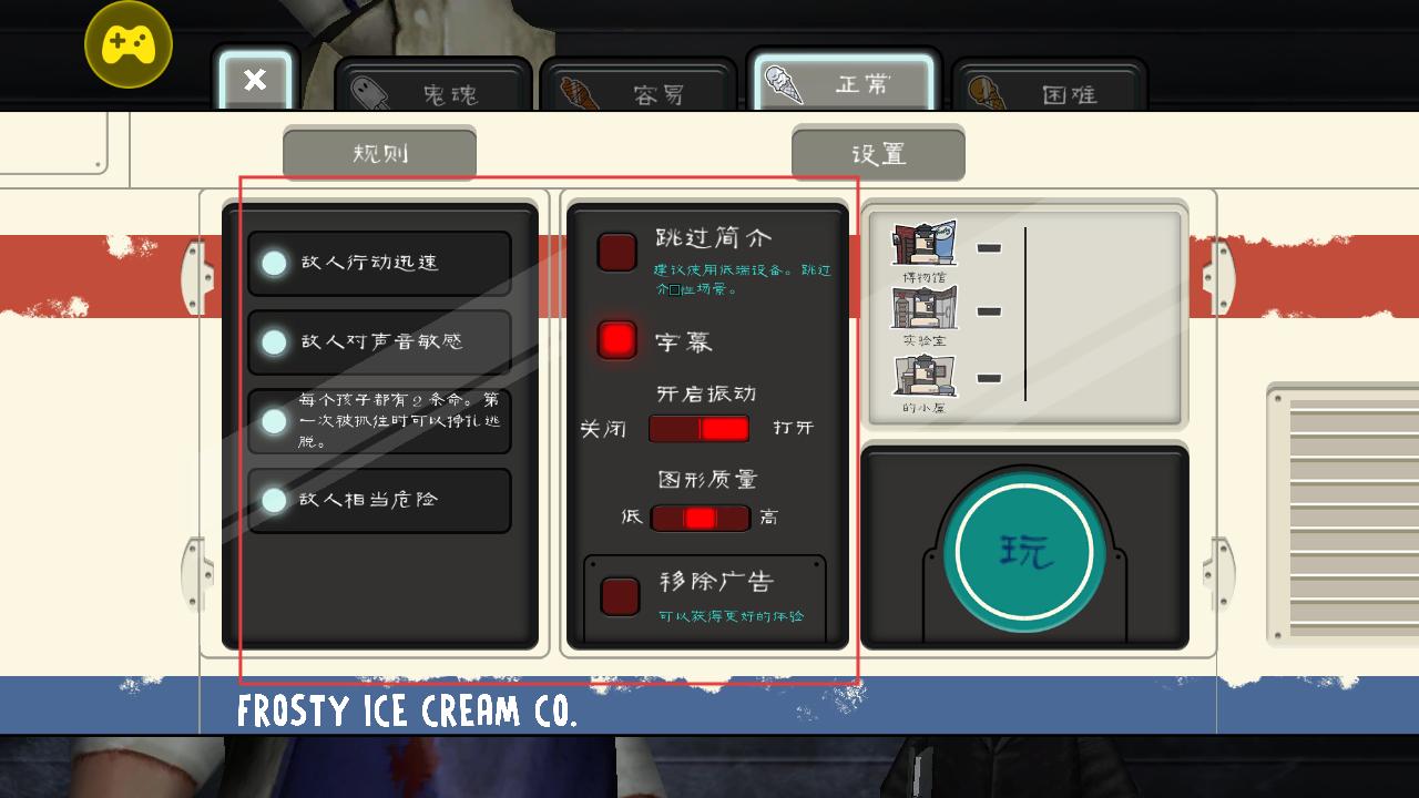 2、进入游戏主界面,点击玩按钮,可选择不同游戏模式,开启与冰淇淋怪人周旋的逃生挑战,体验刺激的冒险过程。