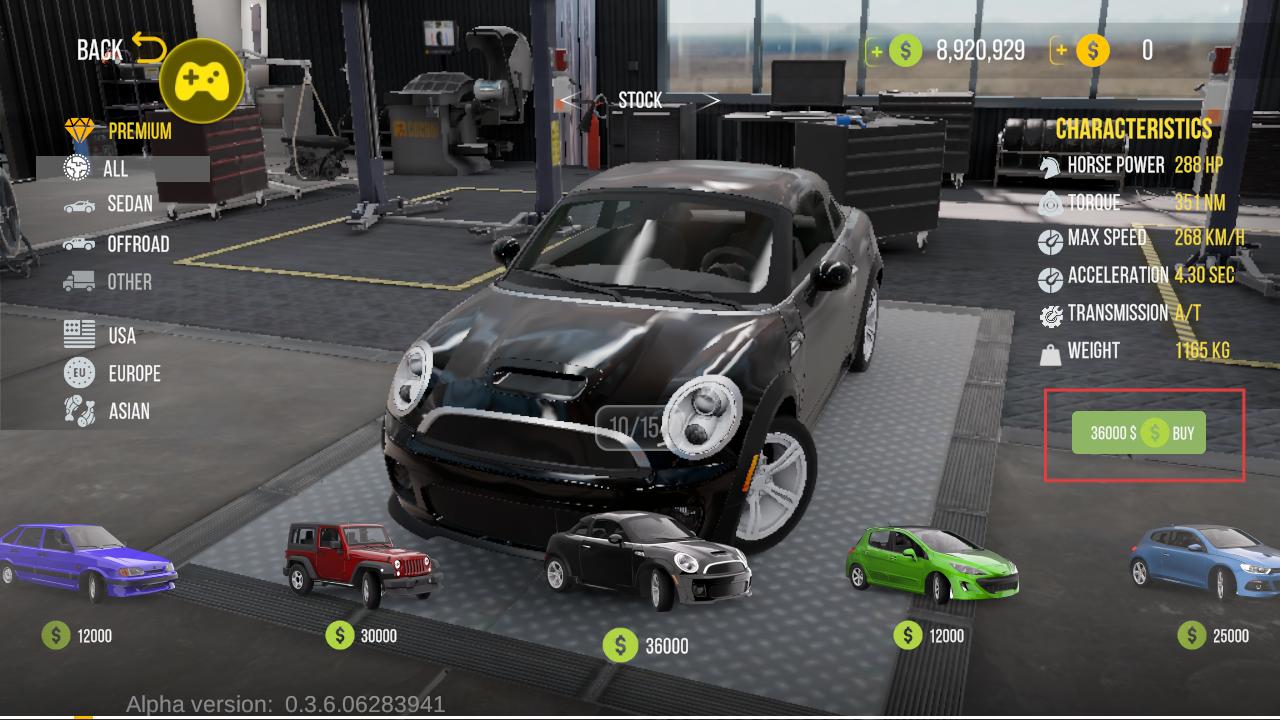 2、在选车界面能浏览SEDAN、OFFROAD等不同类型车辆,查看马力、扭矩等性能参数,点击BUY即可购买心仪车辆。