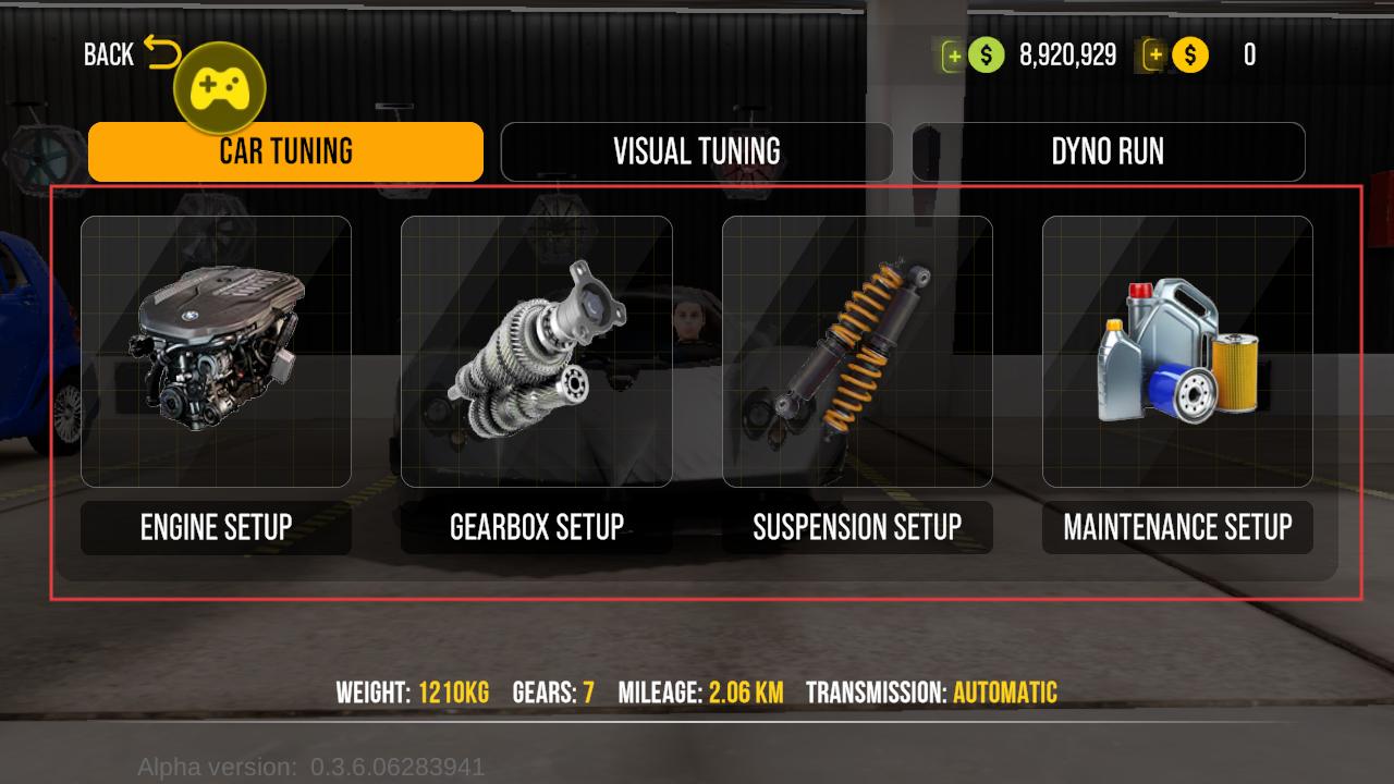 3、进入车辆调校界面,有ENGINE SETUP、GEARBOX SETUP等选项,可对引擎、变速箱、悬架等进行设置,提升车辆性能。