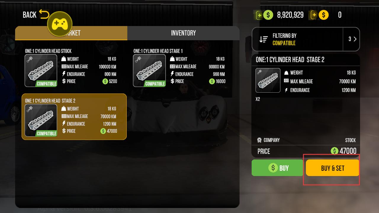 4、在零件市场可选择兼容的车辆零件,查看重量、耐久等信息,点击BUY SET购买并安装,优化车辆部件,增强驾驶体验。