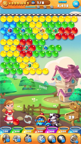 3、持续连接消除三个及以上同色泡泡,逐步清理画面中的泡泡,完成关卡胜利目标。