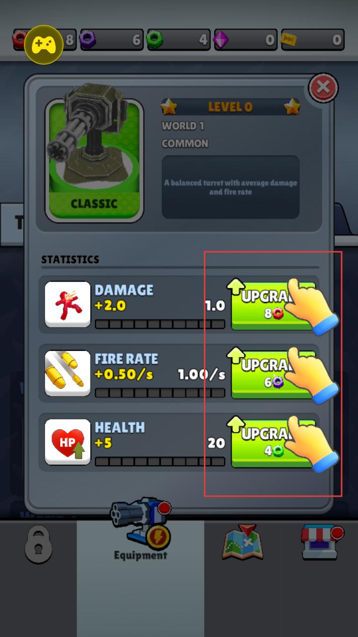 2、点击升级按钮,消耗资源提升炮塔的伤害、射速、生命值等属性,强化炮塔战力,让其在防御中更具优势。