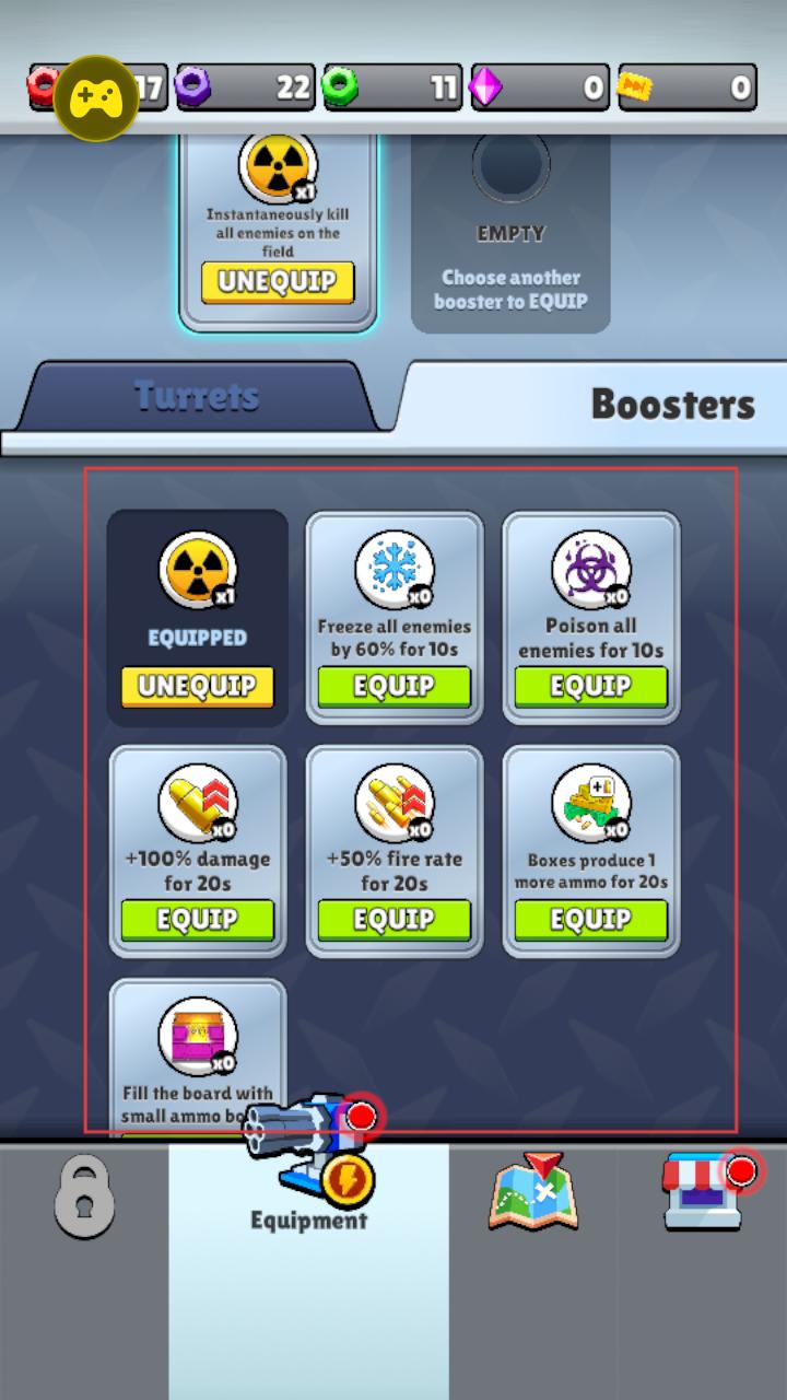 3、在增益道具界面,可装备核爆、冰冻、毒伤等多种道具,根据战斗需求选择,为塔防战斗提供强力助力。