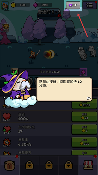 1、点击界面上方按钮,时间将加快10分钟,同时可查看等级、生命值恢复、双防率等属性,还有距离恩惠的进度,开启生存冒险之旅。