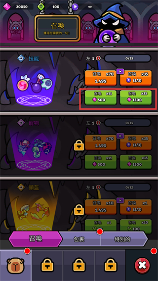 2、进入召唤界面,有技能、宠物、骑宠等召唤选项,可消耗资源进行召唤,提升自身战力,助力在生态世界中更好生存。