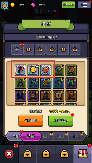 3、在技能界面,可选择不同魔力技能,能看到拥有效果及战力提升情况,还有召唤技能和增益全部按钮,强化技能效果。