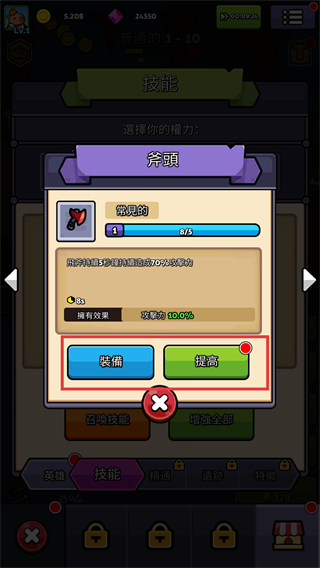 4、点击斧头技能,可查看其详情,有装备和提高按钮,提高后能增加效果,强化攻击等能力,为生存挑战提供更强助力。