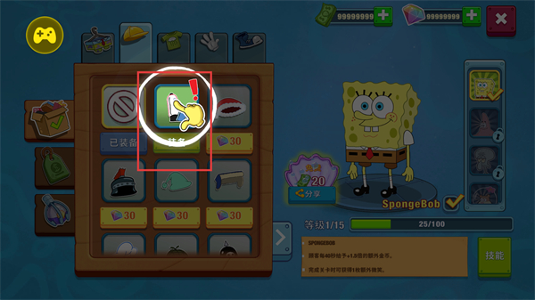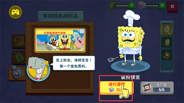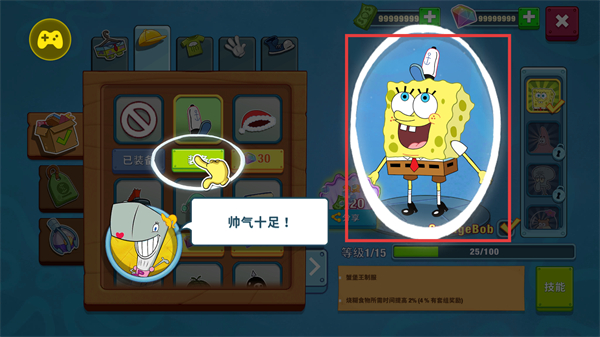 4、点击装扮物品,给海绵宝宝穿上新装扮,呈现帅气造型,享受装扮带来的视觉体验,继续餐厅经营与冒险。