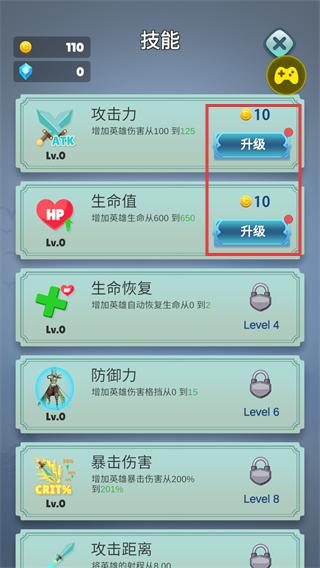 3、进入技能界面,花费金币升级攻击力、生命值等属性,自定义角色成长路线,增强角色战斗能力,为后续战斗做准备。