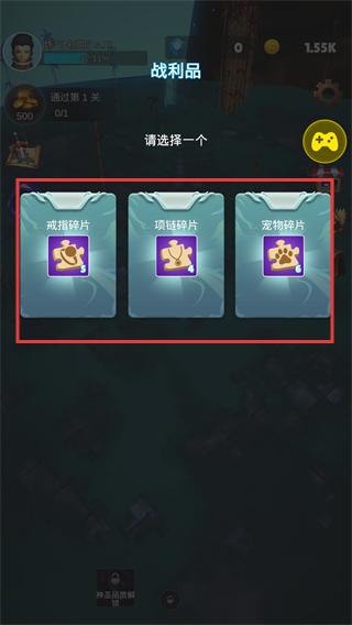 4、战斗后选择战利品,可挑选戒指碎片、项链碎片、宠物碎片等,收集碎片提升装备或解锁宠物,丰富角色养成体验。