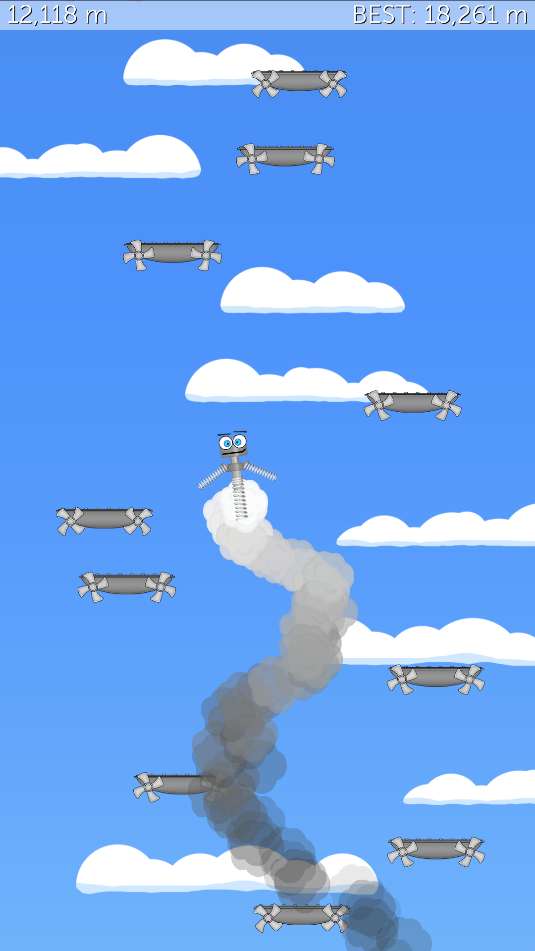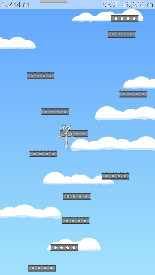 2、游戏中,小弹簧人会自动跳跃,需左右移动来控制弹簧人的跳跃方向,需避免接触锯子,吃到火箭可增加动力。