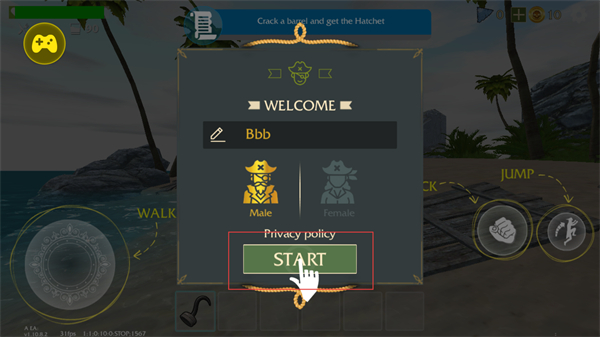1、进入游戏先设置名字,选择性别,点击绿色START按钮,开启在荒岛的海盗生存冒险之旅,准备迎接各种求生挑战。