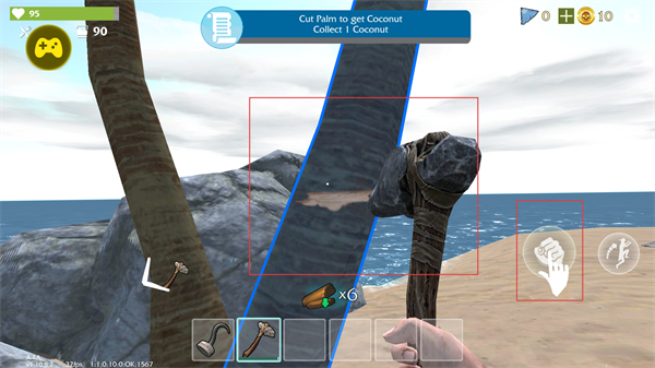 4、装备斧头,砍棕榈树获取椰子,收集生存资源,在荒岛环境中维持生存状态,完成收集椰子的生存任务,助力冒险进程。