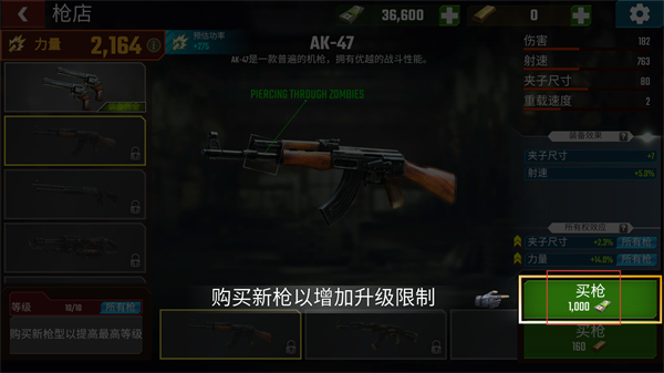 1、处于枪店界面,展示AK47的信息,提示购买新枪以增加升级限制,界面设有买枪按钮,可通过该按钮获取这款枪械。