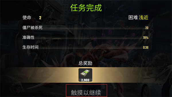 3、任务完成界面展示使命进度、僵尸击杀数等数据,总奖励已呈现,点击触摸以继续按钮,可推进后续的游戏流程。