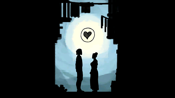 1、开始游戏后,向左走进房子里并点击“爱心”,之后进入房子里,点击两次“时间钟表”。