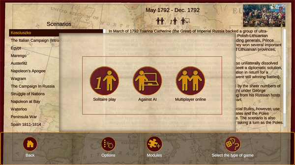 2、选择Kosciuszko剧本,查看该剧本对应的背景剧情,了解1792年波兰相关的战争局势。