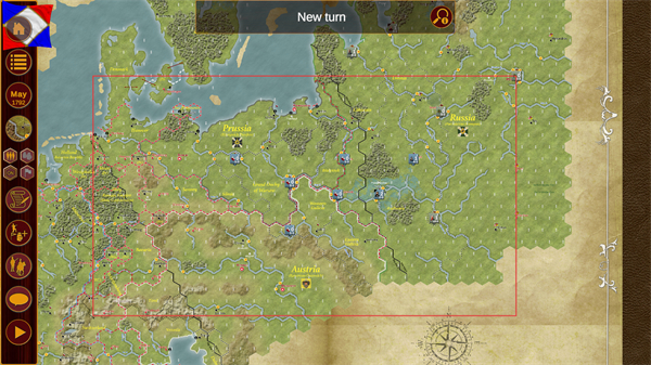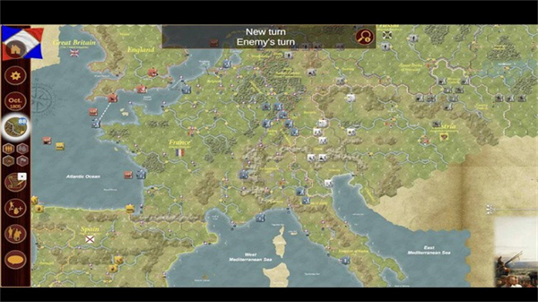 4、点击New turn按钮推进回合,观察地图上各国势力分布,开始规划己方的战略部署。