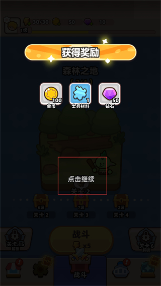 4、在获得奖励弹窗点击点击继续按钮,关闭弹窗并进入后续界面,可继续进行关卡挑战或养成操作。
