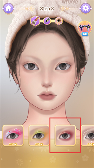 1、在眼妆选择界面,点击选中带有粉色眼影的眼妆样式,应用该眼妆效果,为后续化妆和拍照做准备。