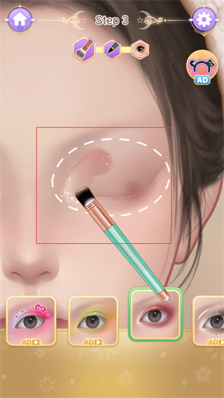 2、拿起眼影笔工具,沿着眼部的虚线区域进行涂抹,完成眼妆的细化晕染,让眼妆效果更自然。