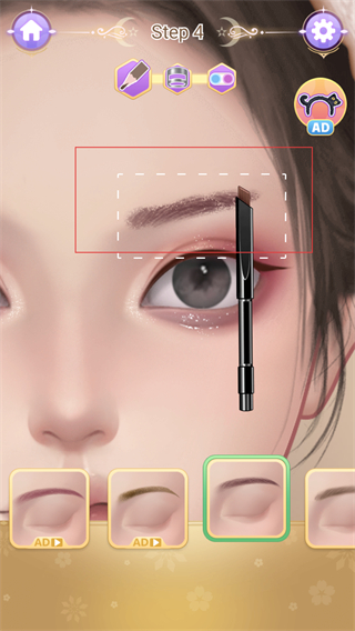 2、面部扫描技术实现精准上妆效果,痘痘肌需要先遮瑕再打底,单眼皮画眼线时会自动生成适合的晕染范围。