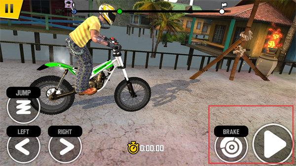 3、操作界面的RIGHT等按钮控制摩托移动,同时可点击BRAKE按钮减速,在赛道中操控车辆前进。