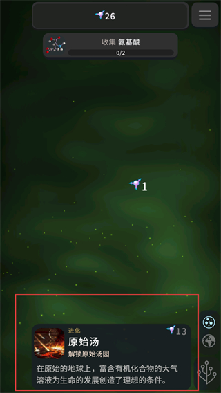 1、点击原始汤对应的进化选项,消耗对应资源解锁该进化阶段,为生命发展创造基础条件。