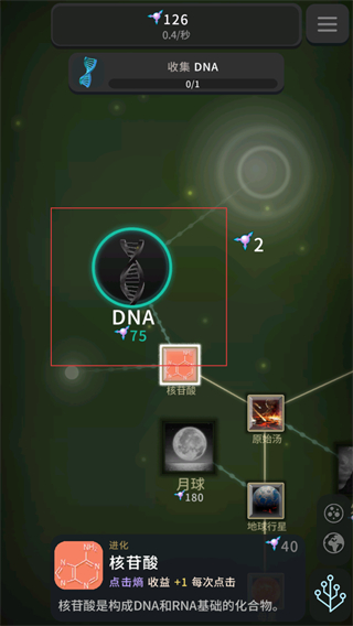 4、点击DNA对应的进化选项,消耗资源解锁该进化阶段,推进生命向包含遗传物质的形态发展。