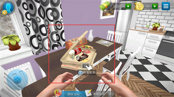 2、点击厨房餐桌上的垃圾,将这些垃圾丢弃,完成厨房清理垃圾任务的部分进度。