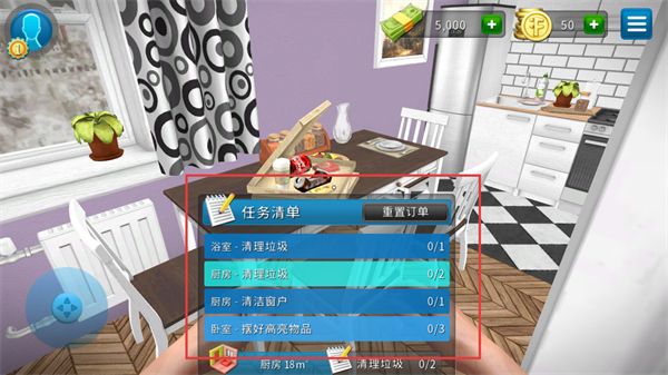 3、点击厨房的窗户,对窗户执行清洁操作,完成清洁窗户的任务,推进任务单的进度。