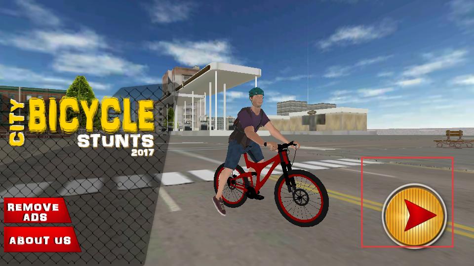 1、进入游戏,看到带有CITY BICYCLE STUNTS2017字样的界面,点击右侧箭头按钮,开启自行车特技挑战。