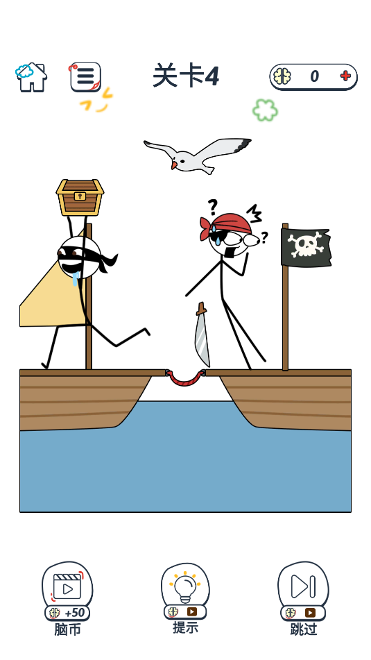 3、小偷想要海盗的宝箱,手臂伸长越过海鸥,拿到海盗后面的宝箱。