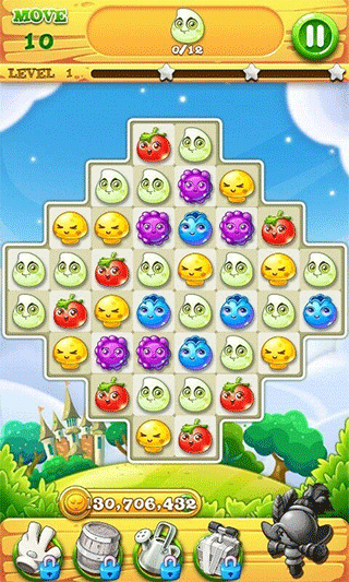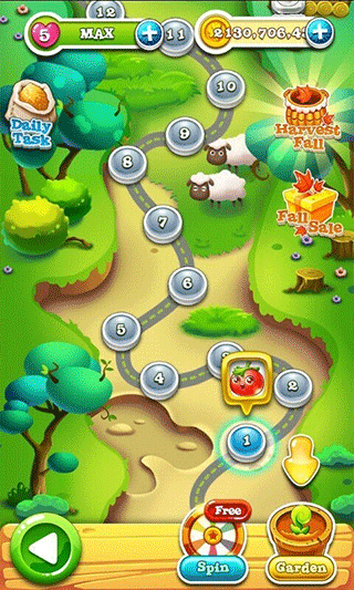 1、三消机制经典,交换相邻作物达成三消,合成特殊作物触发范围消除,关卡设定时间或步数限制,目标为收集指定作物数量。
