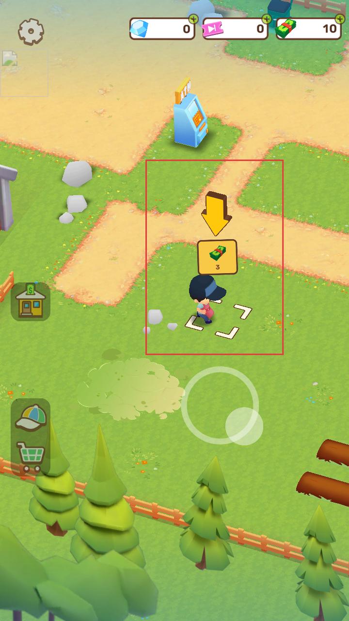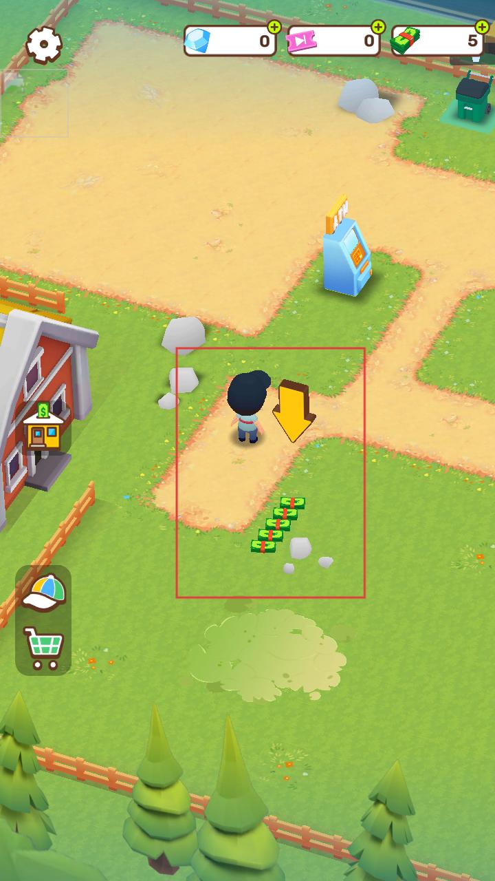 1、进入游戏,操控角色在小镇场景中移动,按照提示,收集散落在地上的钞票,积累初始资金。