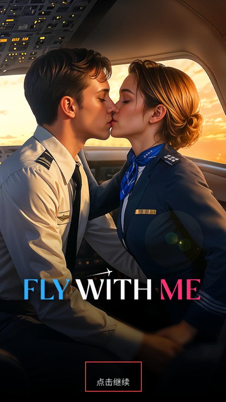 1、进入游戏先看到带有飞行员、空姐元素的标题界面,点击继续即可开启属于你的飞行爱情故事之旅。