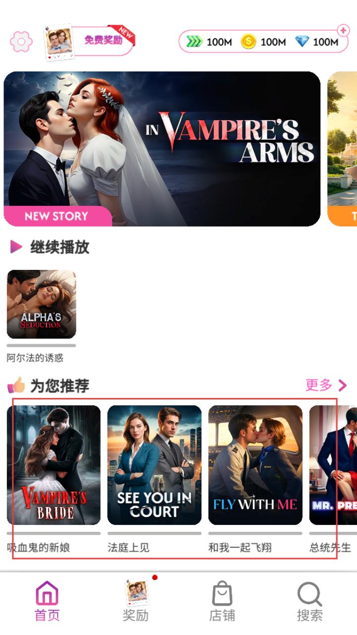2、在首页可看到免费奖励、为您推荐的多款不同题材故事,如吸血鬼的新娘、法庭上见等,选择和我一起飞翔进入对应故事。