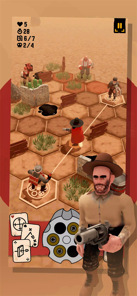 2、回合制战斗机制,敌我轮流行动,牛仔移动、射击、使用技能均占回合,需预判敌人行动路径,规划每回合操作,避免陷入被动。