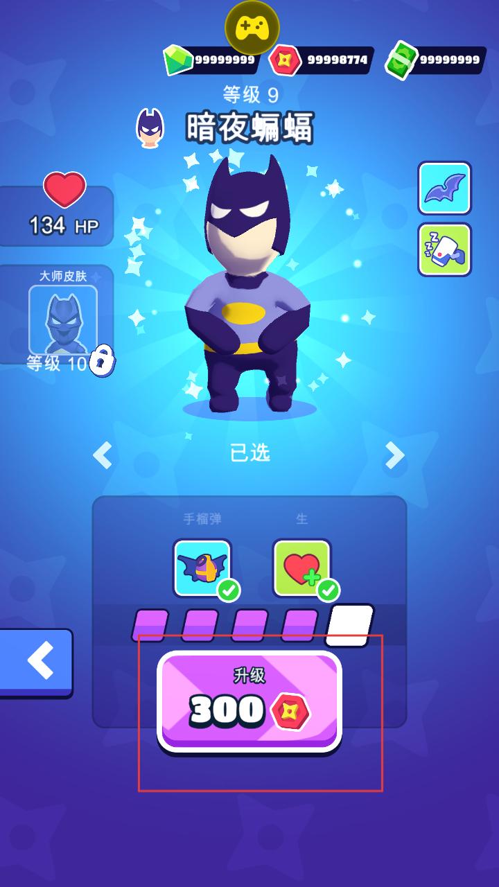 1、可选择暗夜蝙蝠角色,花费300红色道具升级,解锁手榴弹、生命等技能,提升角色的战斗与生存能力,助力潜行闯关。