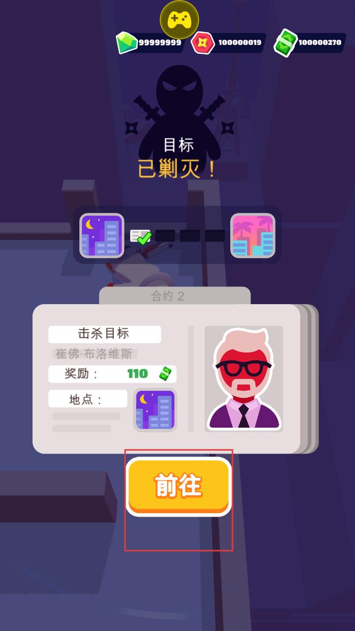 4、完成任务后会显示目标已剿灭,可获取金币奖励,点击前往按钮,开启新的合约任务,继续潜行冒险之旅。