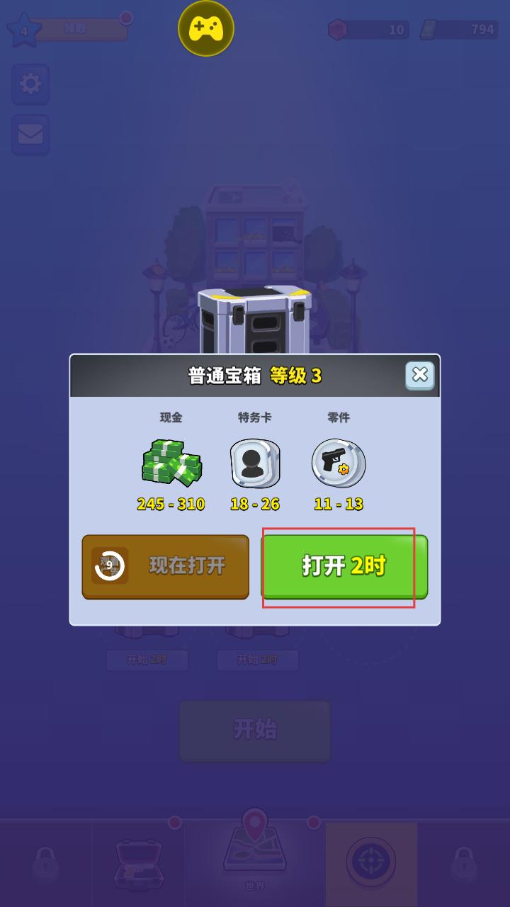 1、游戏中可获得普通宝箱等级3,有现在打开和打开2时两个选项,开启后能得到现金、特务卡、零件等奖励。