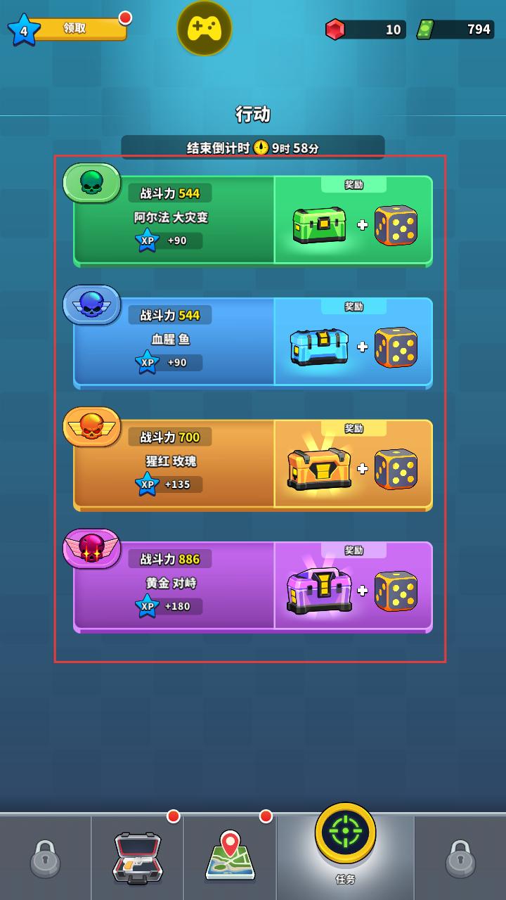 2、在行动界面有多个任务,如战斗力544的阿尔法大灾变、血腥鱼等,完成任务可获得不同宝箱、骰子及XP奖励,注意结束倒计时。
