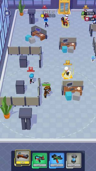 3、战斗时通过虚拟摇杆控制火柴人移动,下方有手枪、冲锋枪、榴弹等武器可选,在有掩体的场景中与敌人对战,需策略利用掩体射击。