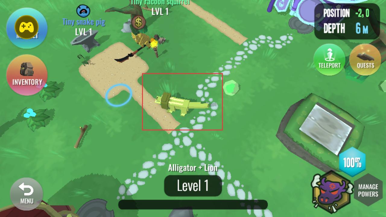 1、操控合成的杂交动物在地图中移动,周围有其他杂交动物,可借助TELEPORT、QUESTS等功能按钮,开启探索与养成的趣味之旅。