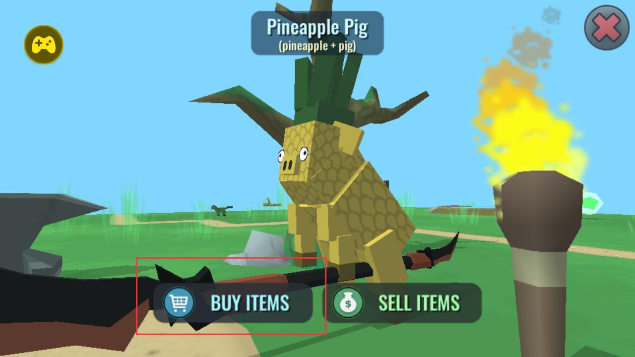2、与Pineapple Pig这类特殊杂交动物互动,点击BUY ITEMS或SELL ITEMS按钮,进行物品交易,获取养成所需资源。