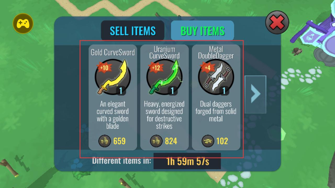 3、在物品界面里能挑选Gold CurveSword、Uranium CurveSword等不同武器,根据需求购买或出售,提升杂交动物的战斗力。