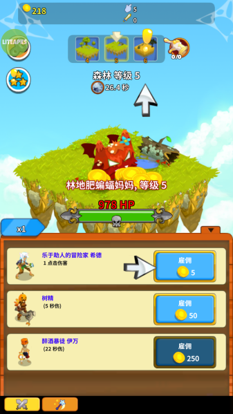 3、雇佣英雄挂机:用金币解锁左下角佣兵,从第二个英雄起可自动输出,解放双手开启挂机收益。